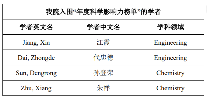 江霞教授、代忠德教授、孙登荣研究员、朱祥研究员入选“年度科学影响力排行榜”。