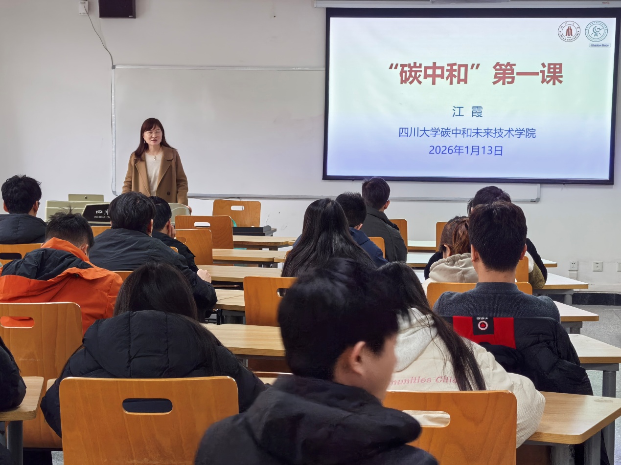 2026年1月13日,学院党总支书记、常务副院长江霞教授在江安校区文科楼三区401教室为2025级研究生讲授了“碳中和”第一课。本次课程围绕碳中和国家战略、学院建设与发展、人才培养与科研创新展开,旨在引导新生深刻理解碳中和事业的重要意义,明确学习科研方向,凝聚未来行动共识。