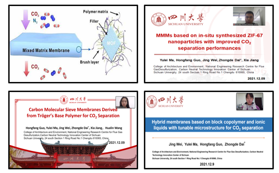 建筑院环境学院2019级硕士马玉磊以“原位合成纳米颗粒混合基质膜的制备及性能研究(Preparation and performance study of in situ synthesized nano particle mixed matrix membranes)”为题介绍了原位合成混合基质膜的制备方法和性能,为混合基质膜捕集CO2提供了有效方案。2020级硕士郭红芳进行了题为“Tröger基聚合物衍生的用于CO2捕集的碳分子筛膜(Carbon molecular sieve membranes derived from Tröger’s base polymer for CO2 separation)”的报告,通过高温碳化Tröger基聚合物,制备了一系列具有良好CO2分离性能的碳分子筛膜。2021级博士魏静着眼于“用于CO2分离的可调节微结构的离子液体/嵌段共聚物混合膜(Hybrid membranes based on block copolymer and ionic liquids with tunable microstructure for CO2 separation)”,展望了离子液体/嵌段共聚物CO2分离膜的制备及应用。